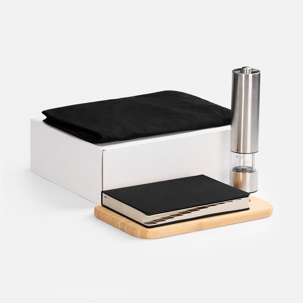 мельница - нержавеющая сталь; пластик; фартук - хлопок 100%, плотность 240 г/м²; ежедневник - покрытие софт-тач; доска - бамбук; коробка - микрогофрокартон, Т-23Е