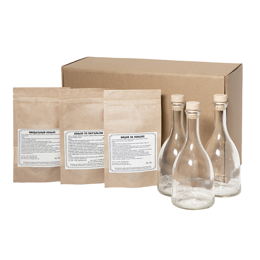 Сам Себе Сомелье - коллекция сборов трав и специй для приготовления уникальных напитков. В состав набора арт. 39477 входят:- стружка- коробка подарочная арт. 34931, размер 40 х 25 х 15 см- три стеклянные бутылки объемом 0,5 литра- три полимерные пробки- три сбора для приготовления ликеров. Коньяк по- Латгальски напоминает вкус элитного, выдержанного годами коньяка. Особенное отличие напитка – это получение такого же вкуса за короткое время, как и у коньяка при длительном настаивании. Дорогие ёмкости заменяет дубовые кубики, а для придания вкусового сходства используют специи. Состав: Гвоздика, кора дуба, кардамон, дубовые кубики, мускатный орех молотый, ванилин, изюм. Вишня на коньяке - это домашняя настойка, которая имеет красивый рубиновый цвет и нежный вишнёвый вкус. Состав: Вишня вяленая, дубовые кубики средней обжарки (Кавказ), корица, миндаль, изюм, гвоздика, плоды шиповника. Миндальный коньяк обладает терпким вкусом с долгим послевкусием вишни. Дубовые кубики средней обжарки облагораживают настойку и придают нотки выдержанного элитного алкоголя.Эта настойка для любителей натуральных напитков и для тех, кто любит удивлять своих гостей. Пить напиток можно как в чистом виде, так и добавлять в кофе или чай. Состав: Дубовые кубики средней обжарки (Кавказ), корица, миндаль, изюм, гвоздика, вяленая вишня. Каждый сбор рассчитан на 0,5 литра готового продукта. Хочешь сделать хорошо? Сделай это сам! Рецепт указан на упаковке. ВНИМАНИЕ Набор поставляется в разобранном виде в количестве кратном трём (наборам).