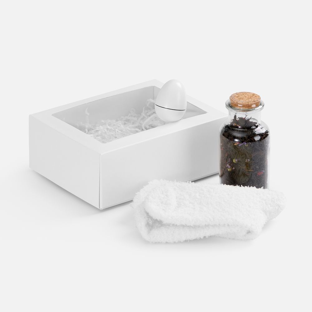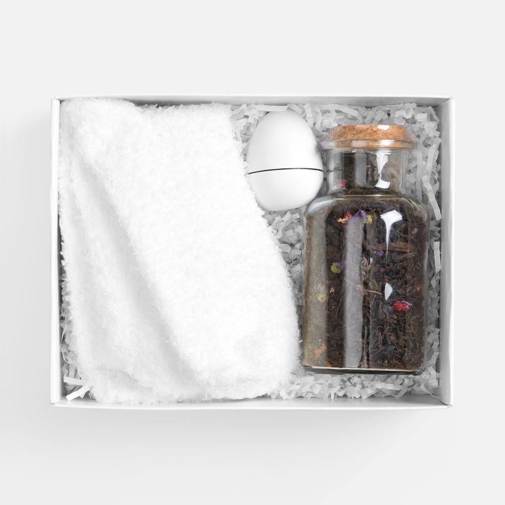 коробка - картон; упаковка чая - стекло; бальзам - пластик; носки - полиэстер 100%