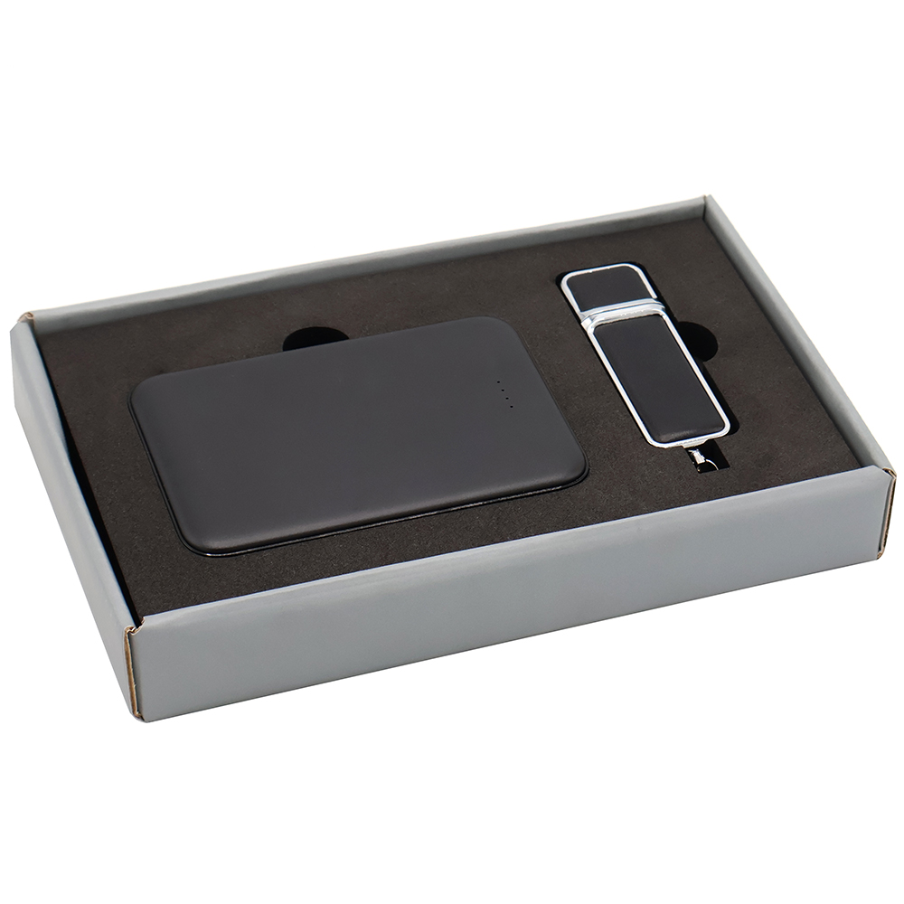 Подарочный набор в стильной цветной картонной коробке серого цвета с конструкцией крышка-дно. Внутри на аккуратном ложементе расположены внешний аккумулятор емкостью 5 000 mAh и элегантная флешка объемом 16 ГБ в корпусе с вставками из искусственной кожи. Мощный аккумулятор обеспечивает быстрое и надежное питание мобильных устройств, а флешка в изысканном дизайне сочетает вместительность с темой премиального стиля, надежно сохраняя ваши цифровые файлы. Такой набор станет стильным и практичным подарком для деловых и активных людей, ценящих качество и эстетичность. Состав набора: Внешний аккумулятор Fluffy, чёрный (артикул 2041.02) - 1 шт. Флешка Business 16 Гб, черный (артикул 3007.02) - 1 шт. Коробка Protect матовой поверхностью, серый (артикул RUS5051.19) - 1 шт.