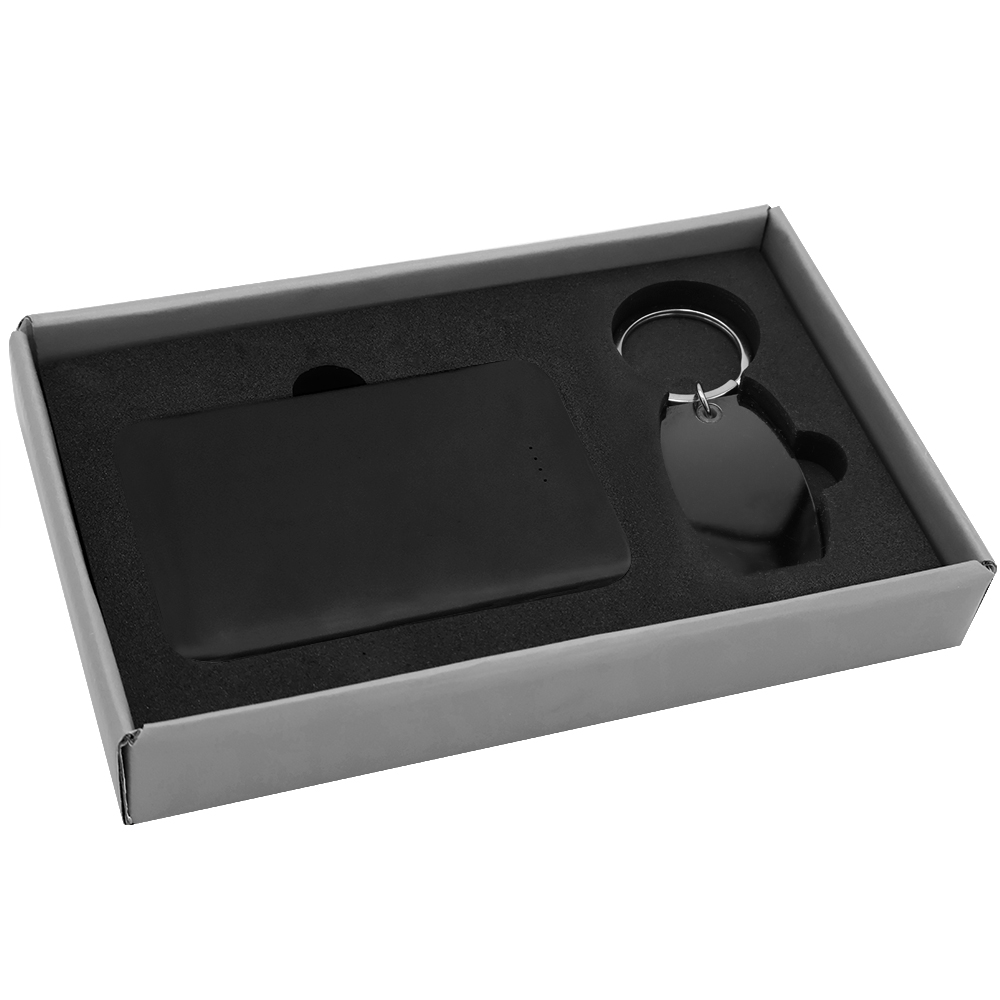 Подарочный набор в элегантной цветной картонной коробке серого цвета с конструкцией крышка-дно. Внутри расположены аккуратно закрепленные на ложементе внешний аккумулятор емкостью 5000 mAh и металлический карманный брелок. Внешний аккумулятор обладает компактным дизайном и обеспечивает надежный запас энергии для мобильных устройств в пути, а стильный металлический брелок станет практичным и эстетичным аксессуаром для ключей. Этот набор идеально подходит в качестве презента для тех, кто ценит удобство, качество и современный стиль. Состав набора: 1. Внешний аккумулятор Fluffy, чёрный (артикул 2041.02) - 1 шт. 2. Брелок Nobel металлический, чёрный (артикул 12011.02) - 1 шт. 3. Коробка Protect матовой поверхностью, серый (артикул RUS5051.19) - 1 шт.