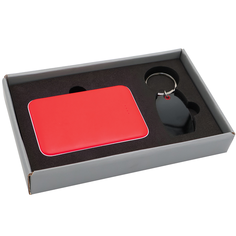Подарочный набор в элегантной цветной картонной коробке серого цвета с конструкцией крышка-дно. Внутри расположены аккуратно закрепленные на ложементе внешний аккумулятор емкостью 5000 mAh и металлический карманный брелок. Внешний аккумулятор обладает компактным дизайном и обеспечивает надежный запас энергии для мобильных устройств в пути, а стильный металлический брелок станет практичным и эстетичным аксессуаром для ключей. Этот набор идеально подходит в качестве презента для тех, кто ценит удобство, качество и современный стиль. Состав набора: 1. Внешний аккумулятор Fluffy, красный (артикул 2041.05) - 1 шт. 2. Брелок Nobel металлический, красный (артикул 12011.05) - 1 шт. 3. Коробка Protect матовой поверхностью, серый (артикул RUS5051.19) - 1 шт.