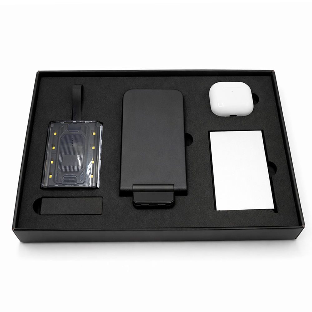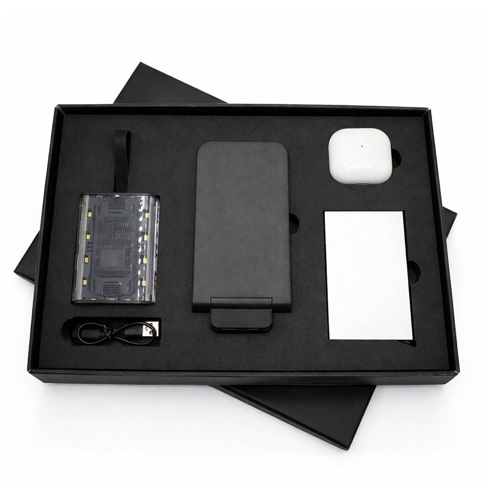 "Pinter" — Подарочный набор в элегантной цветной коробке черного цвета (RUS5052.19) с конструкцией крышка-дно. Внутри расположен ложемент, специально разработанный для надежного и аккуратного размещения всех элементов набора. В набор входят: Внешний аккумулятор Courage, 5000 Mah, черный (арт. 2048.02) Беспроводное складное зарядное устройство Malford 15W, черный (арт. 7050.02) Наушники беспроводные Bluetooth Neat, белый (арт.47007.01) Держатель банковских карт Visir, серебристый (арт.37000.01)