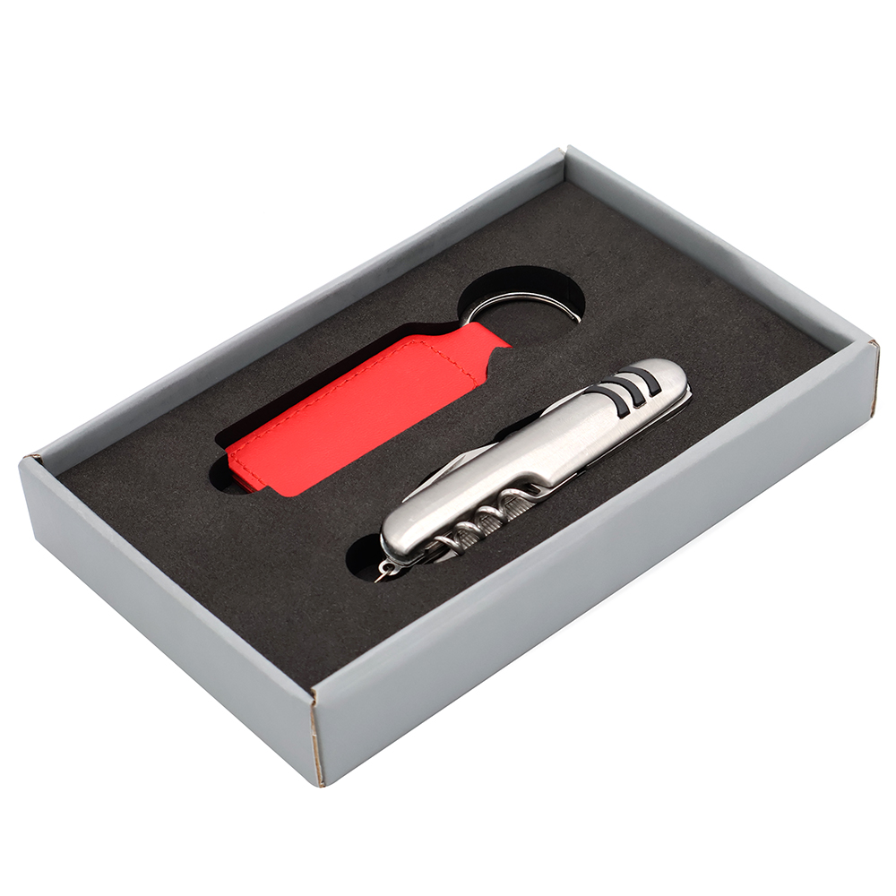 Подарочный набор «Элемент» - функциональность в деталях. • Нож — для дел. • Брелок — для ключей. • Стиль — для вас. Три элемента вашей ежедневной готовности. Упаковано в элегантную коробку — отличный подарок для решения любых задач. Состав набора: 1. Нож многофункциональный Дрезден, серебристый (артикул 39013.09) - 1 шт. 2. Брелок Hors, красный (артикул 12019.05) - 1 шт. 3. Коробка Protect матовой поверхностью, серый (артикул RUS5051.19) - 1 шт.