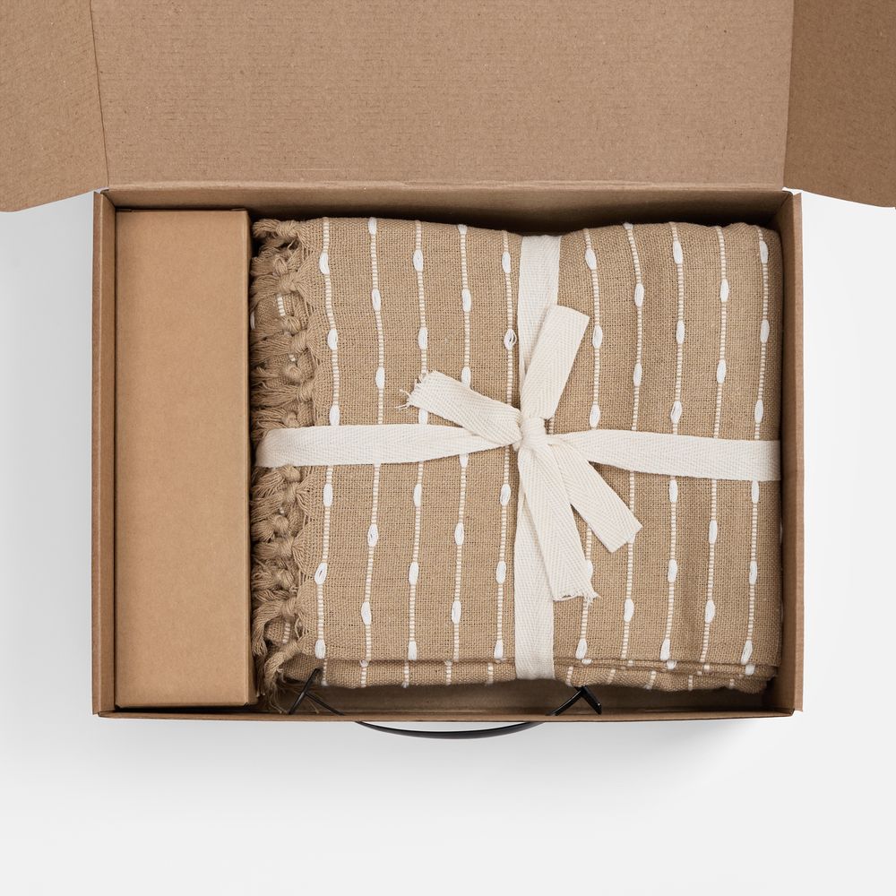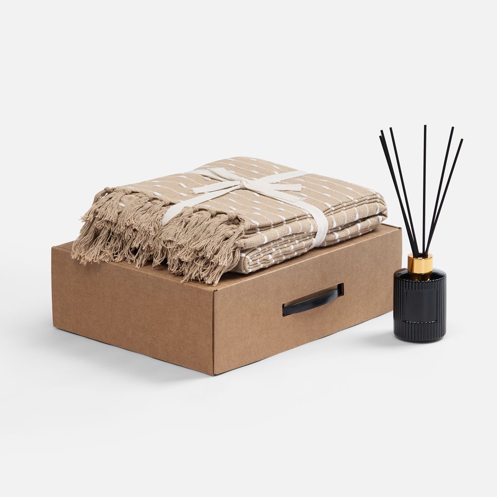 плед - хлопок 80%, полиэстер 20%, плотность 300 г/м²; флакон - стекло, палочки из файбера; коробка - микрогофрокартон