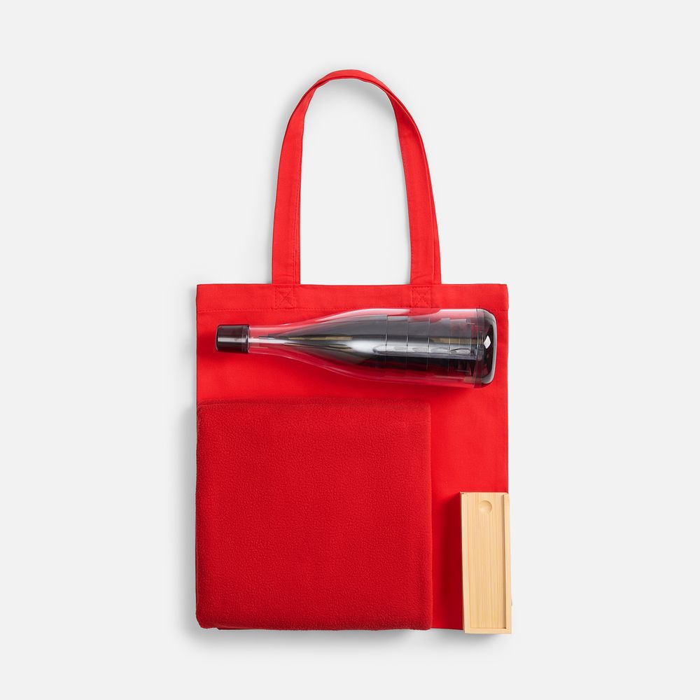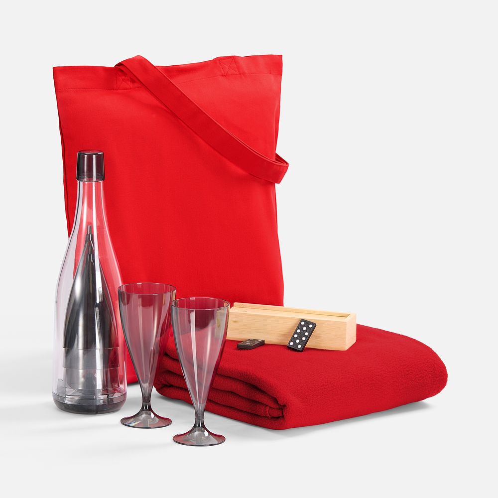 плед - флис, плотность 180 г/м²; набор бокалов - пластик; футляр для домино - бамбук; костяшки - МДФ; сумка - хлопок 100%, плотность 220 г/м²; саржа