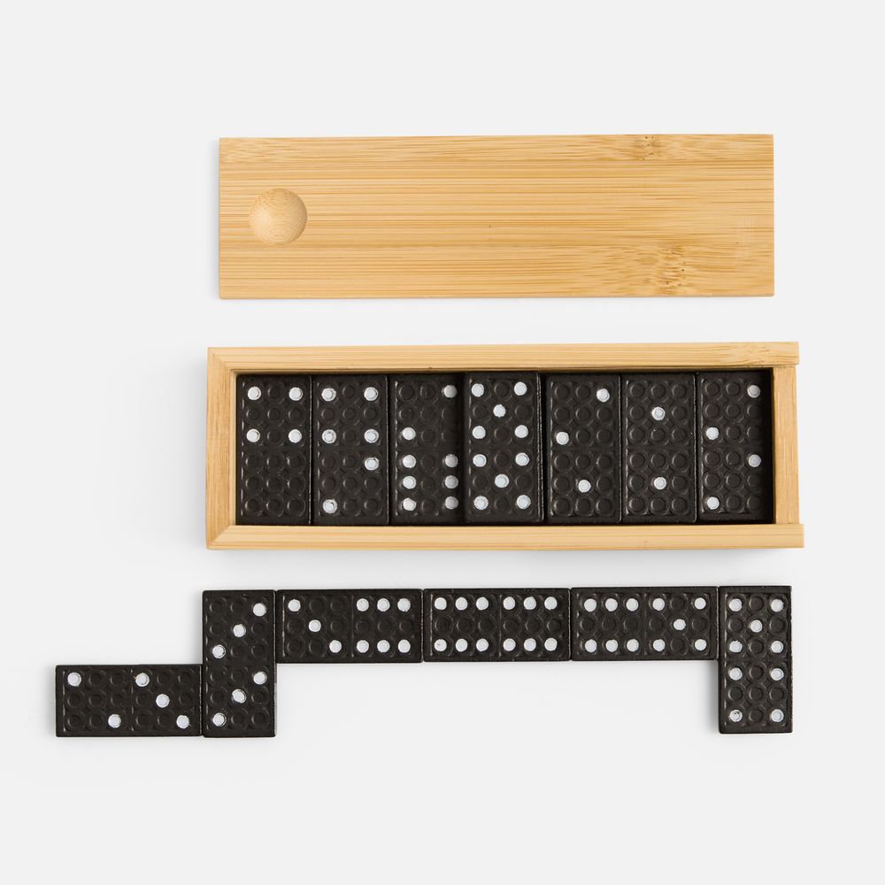 плед - флис, плотность 180 г/м²; набор бокалов - пластик; футляр для домино - бамбук; костяшки - МДФ; сумка - хлопок 100%, плотность 220 г/м²; саржа