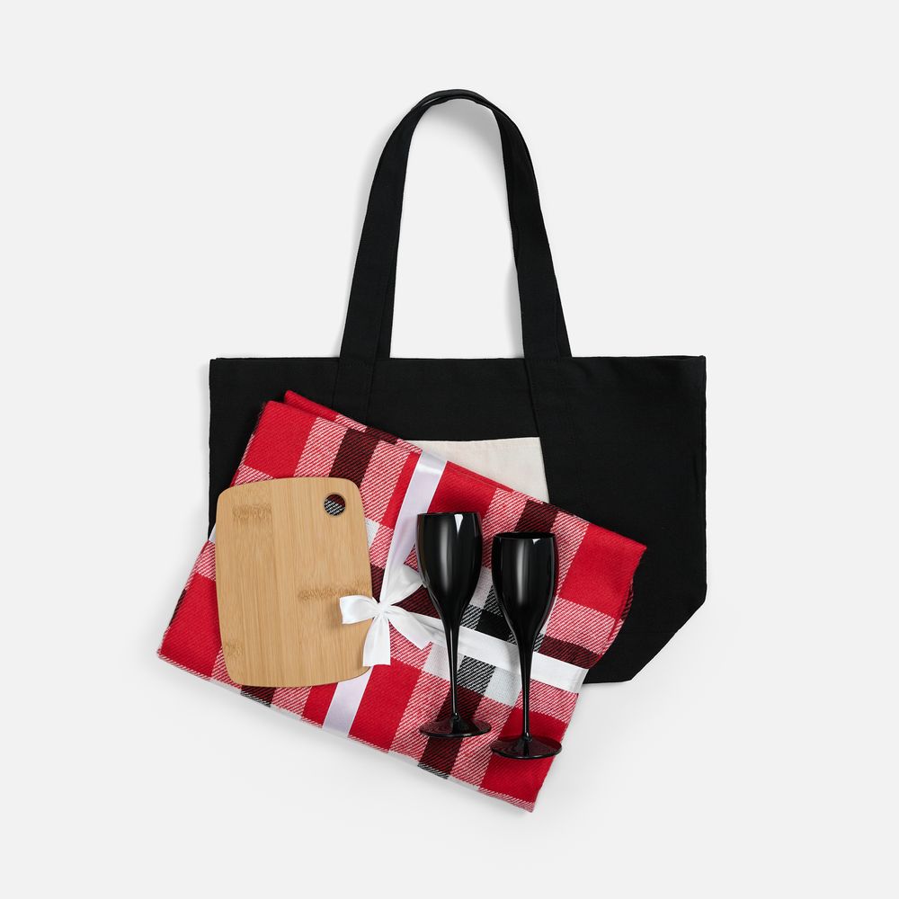 плед - шерсть 15%; хлопок 5%; полиэстер 60%; акрил 20%, плотность 200 г/м²; шопер - полиэстер 60%, переработанный хлопок 40%, плотность 340 г/м²; бокалы - пластик; доска - бамбук