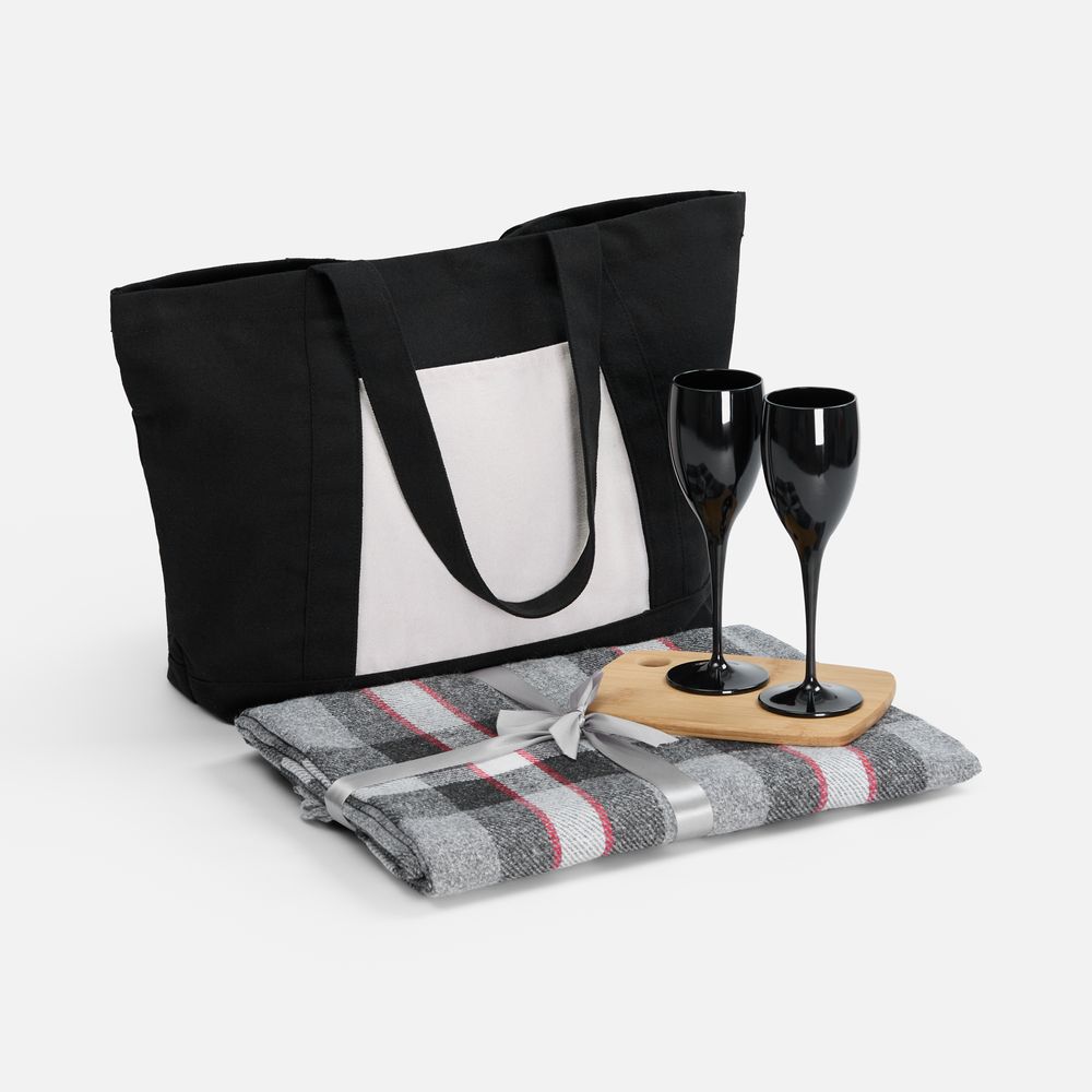 Этот стильный и лаконичный набор для пикника собрал все необходимое для комфортной и уютной вылазки на природу — теплый яркий плед, 2 бокала для шампанского и миниатюрную доску для нарезки и подачи любимых закусок. Все это легко помещается в стильный шопер.