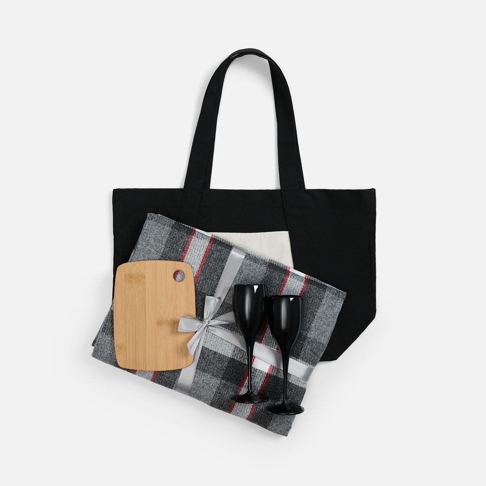 плед - шерсть 15%; хлопок 5%; полиэстер 60%; акрил 20%, плотность 200 г/м²; шопер - полиэстер 60%, переработанный хлопок 40%, плотность 340 г/м²; бокалы - пластик; доска - бамбук