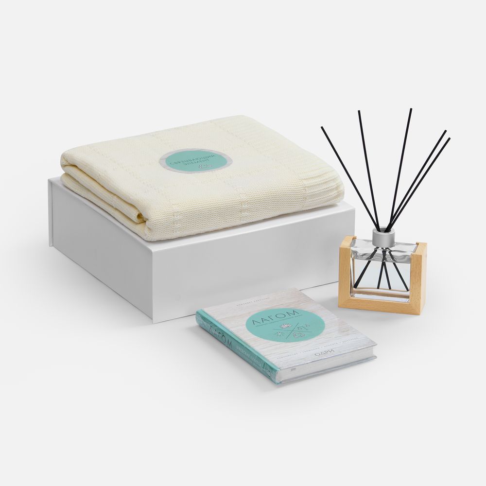 плед - акрил 100%; коробка - переплетный картон; флакон - стекло; подставка для флакона - дерево, палочки из файбера