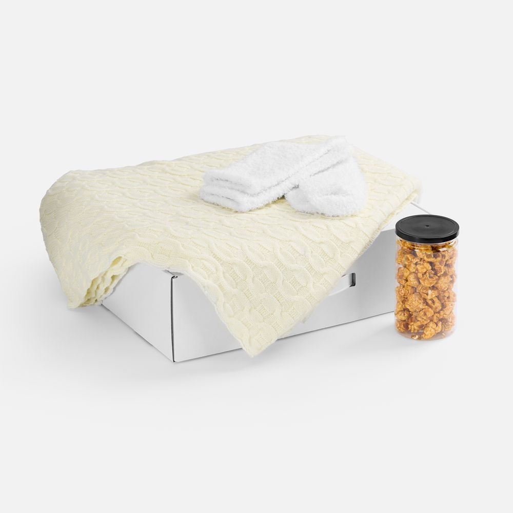 коробка - микрогофрокартон, пластик; плед - акрил 100%; упаковка попкорна - пластик; носки - полиэстер 100%
