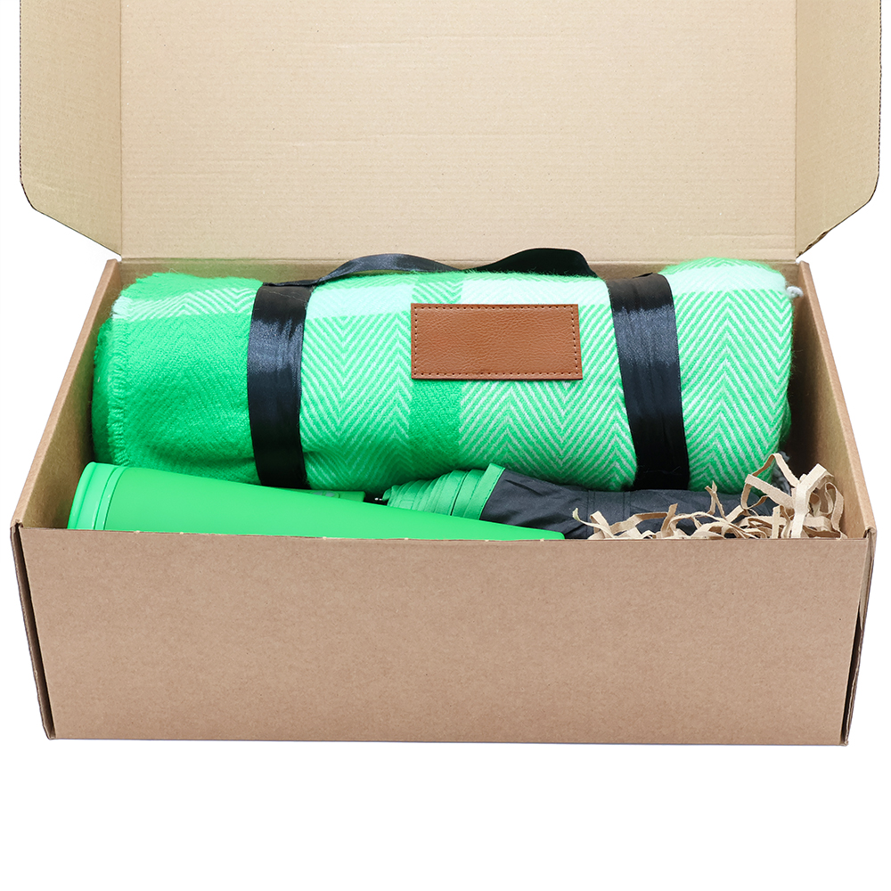 AUTUMN MOOD — воплощение уюта и гармонии вдохновленное самыми прекрасными осенними моментами. Почувствуйте магию осени с этим набором. Теплый плед, горячий чай и прогулка в дождливый день. В нём собрано всё, чтобы замедлить время, согреть и напомнить о самых простых и важных радостях. Остановите мгновение, чтобы почувствовать настроение осени . Состав набора: 1. Плед акриловый Glama зелёный (артикул 16005.04) - 1 шт. 2. Противоштормовой автоматический зонт Line зелёный (артикул 8015.04) - 1 шт. 3. Термокружка Carroll софт-тач зелёная (артикул 5022.04) - 1 шт. 4. Коробка Humble бежевая (артикул RUS5054.19) - 1 шт. 5. Наполнитель - стружка бумажная коричневая (артикул 00-00080984) - 1 шт.