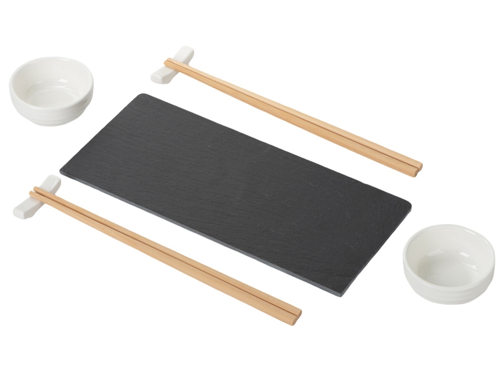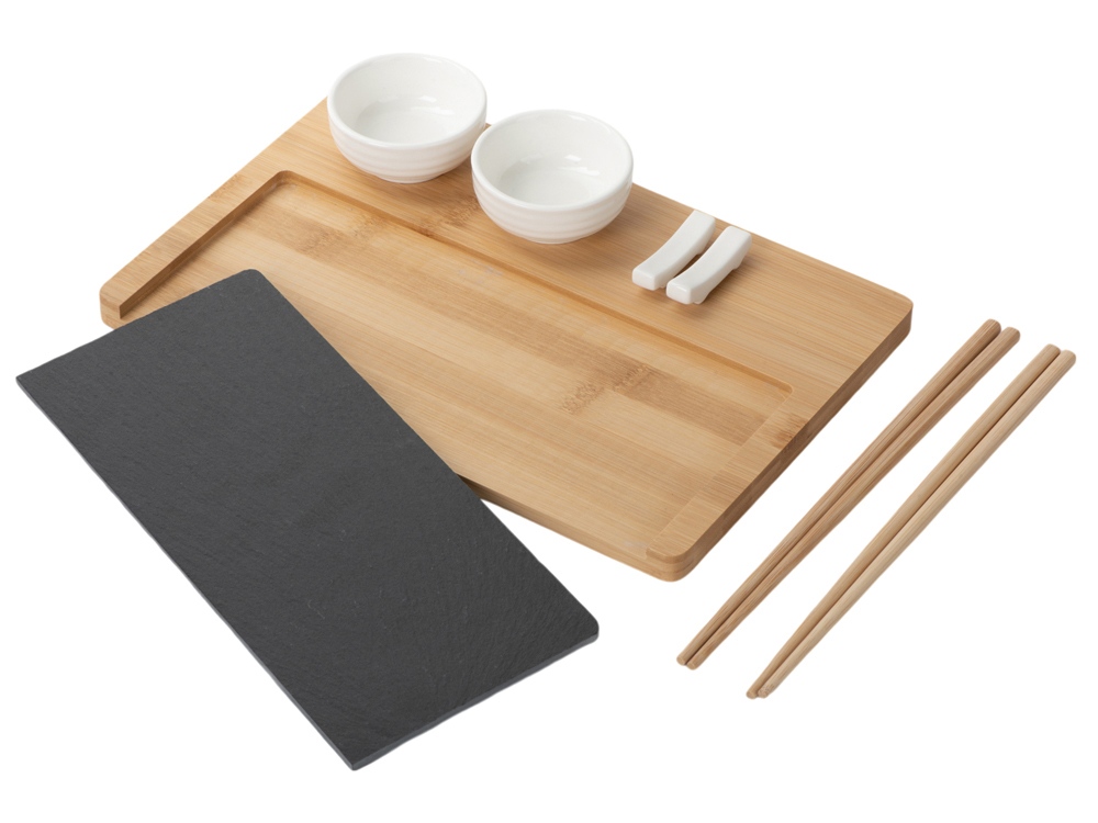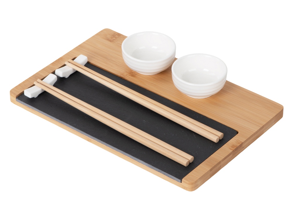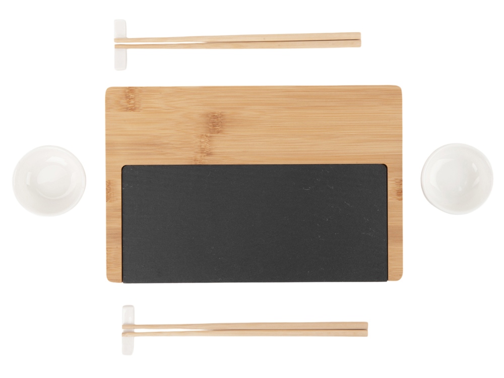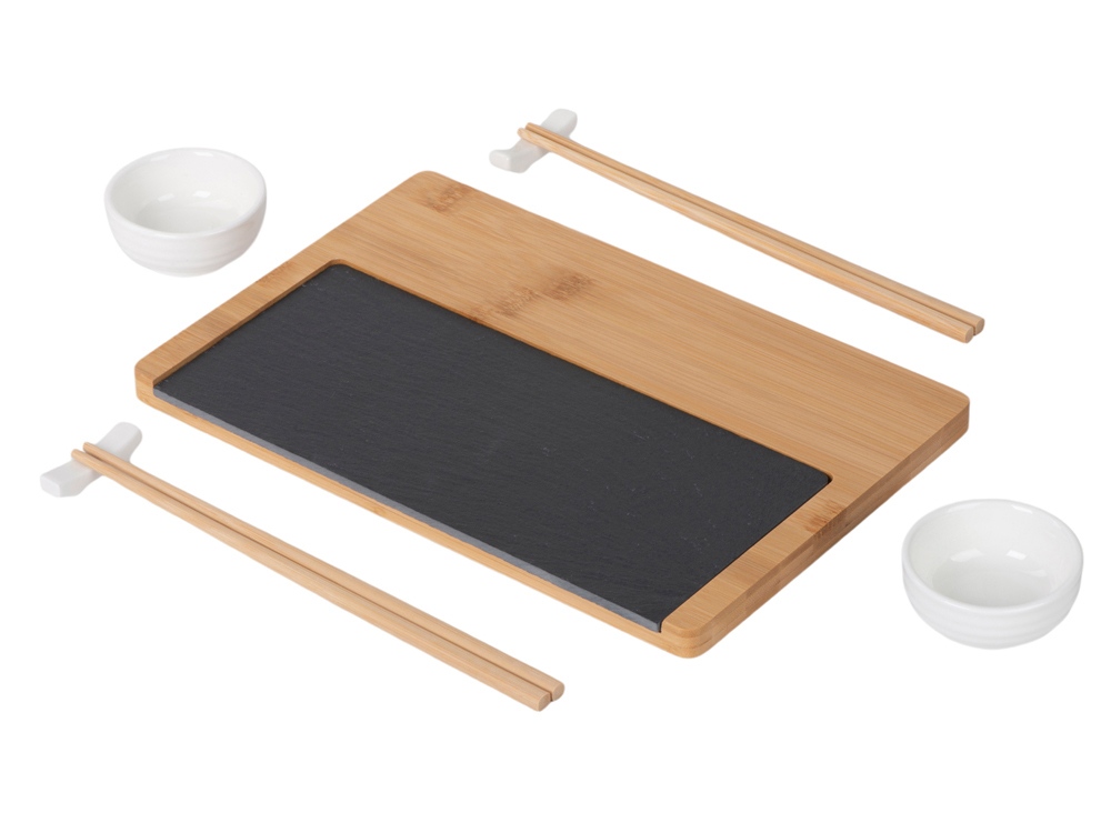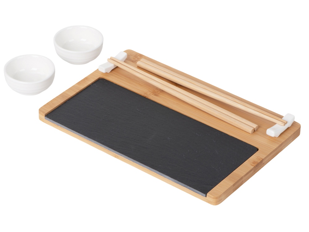 бамбуковая доска- 30 х 20 х 1,9 см, сланцевая доска- 26,7 х 11,9 х 0,5 см, палочки- 25 см, соусницы d7,2 х 3 см