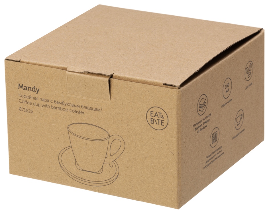 Чашка изготовлена из костяного фарфора, - более тонкого и изящного по сравнению с обычной глиняной керамикой, и прекрасно подойдёт для кофе (объём 160 мл). Бамбуковое блюдце имеет выемку для чашки, поэтому "Mandy" можно аккуратно разместить на столе, не занимая много места. Кофейная пара от бренда Eat&Bite смотрится эстетично и красиво из-за нестандартного дизайна - фигурной ручки чашки и квадратного донышка, которое точно подходит под выемку блюдца. - стильный и необычный дизайн; - объём чашки 160 мл; - костяной фарфор и бамбук; - компактное хранение;