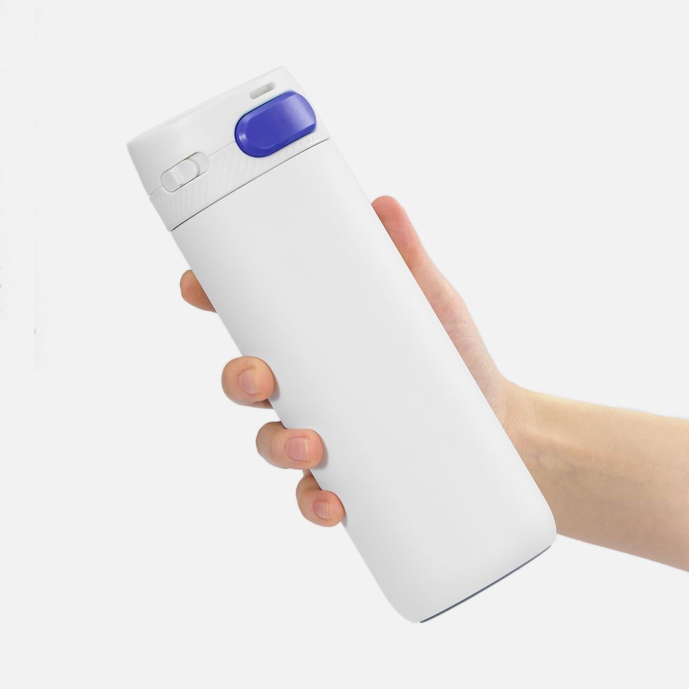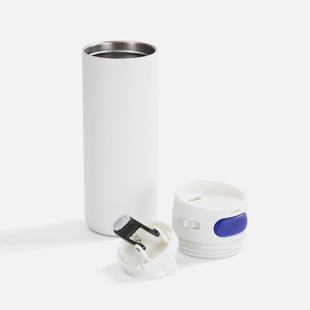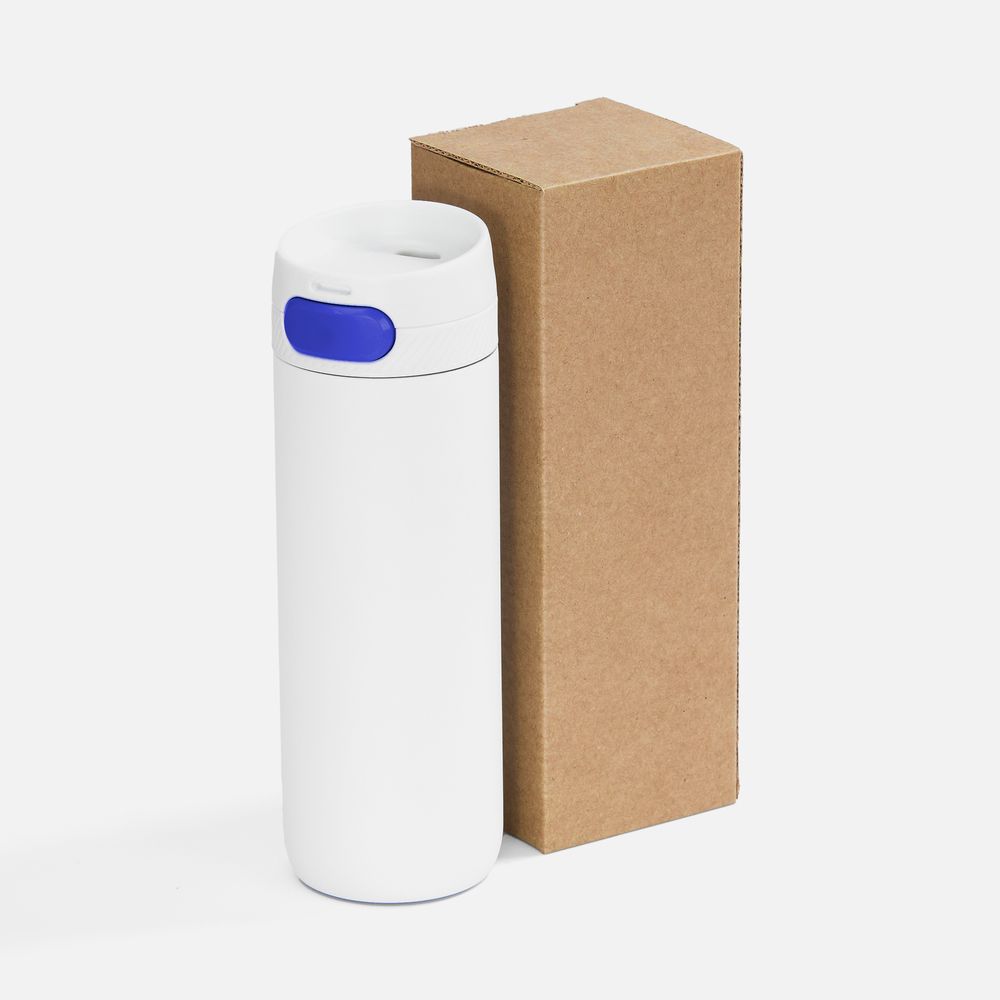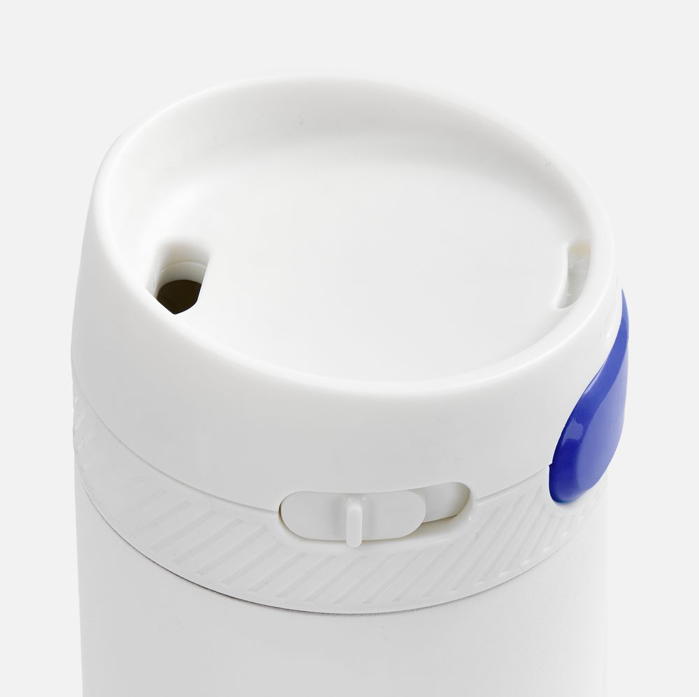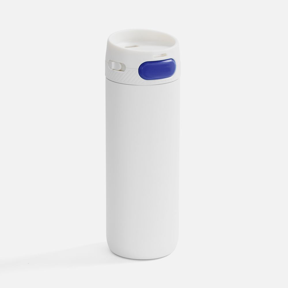 Термостакан X1 с цветной кнопкой, белый с синим диаметр дна 7 см, высота 22,5 см; упаковка: 23,7х8,2х8,2 см