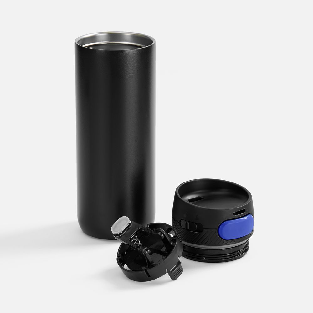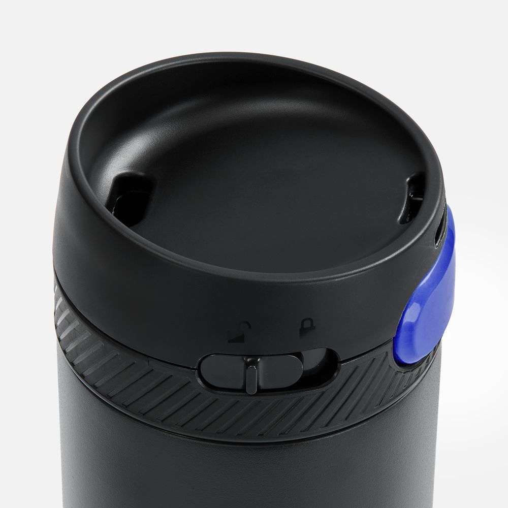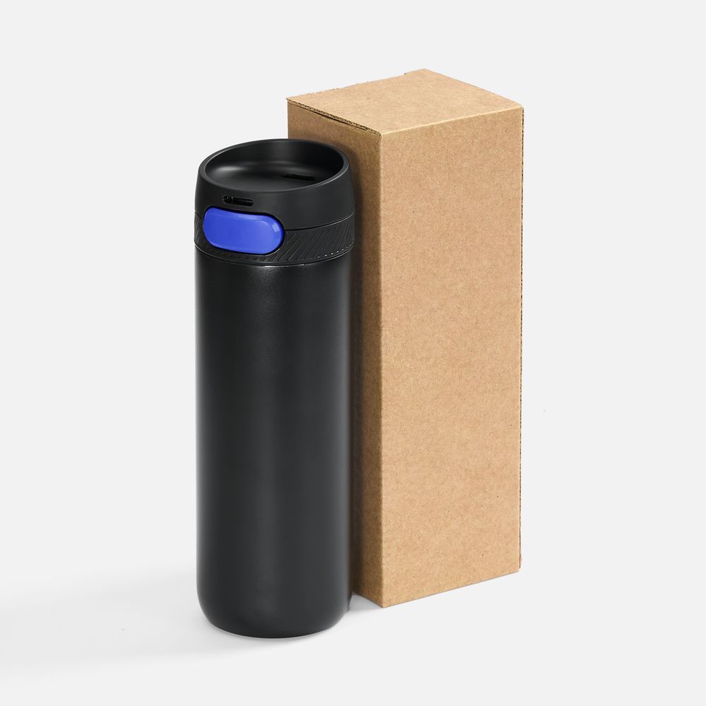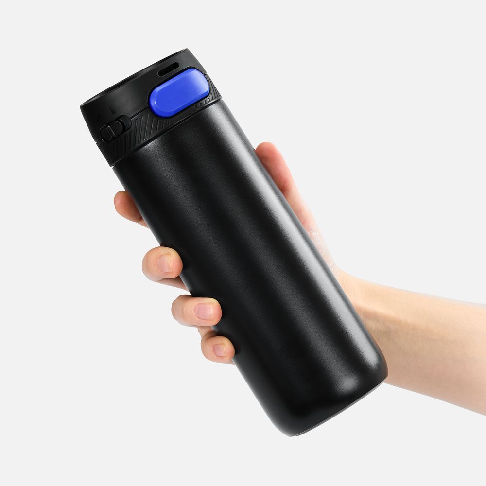 Термостакан X1 с цветной кнопкой, черный с синим диаметр дна 7 см, высота 22,5 см; упаковка: 23,7х8,2х8,2 см