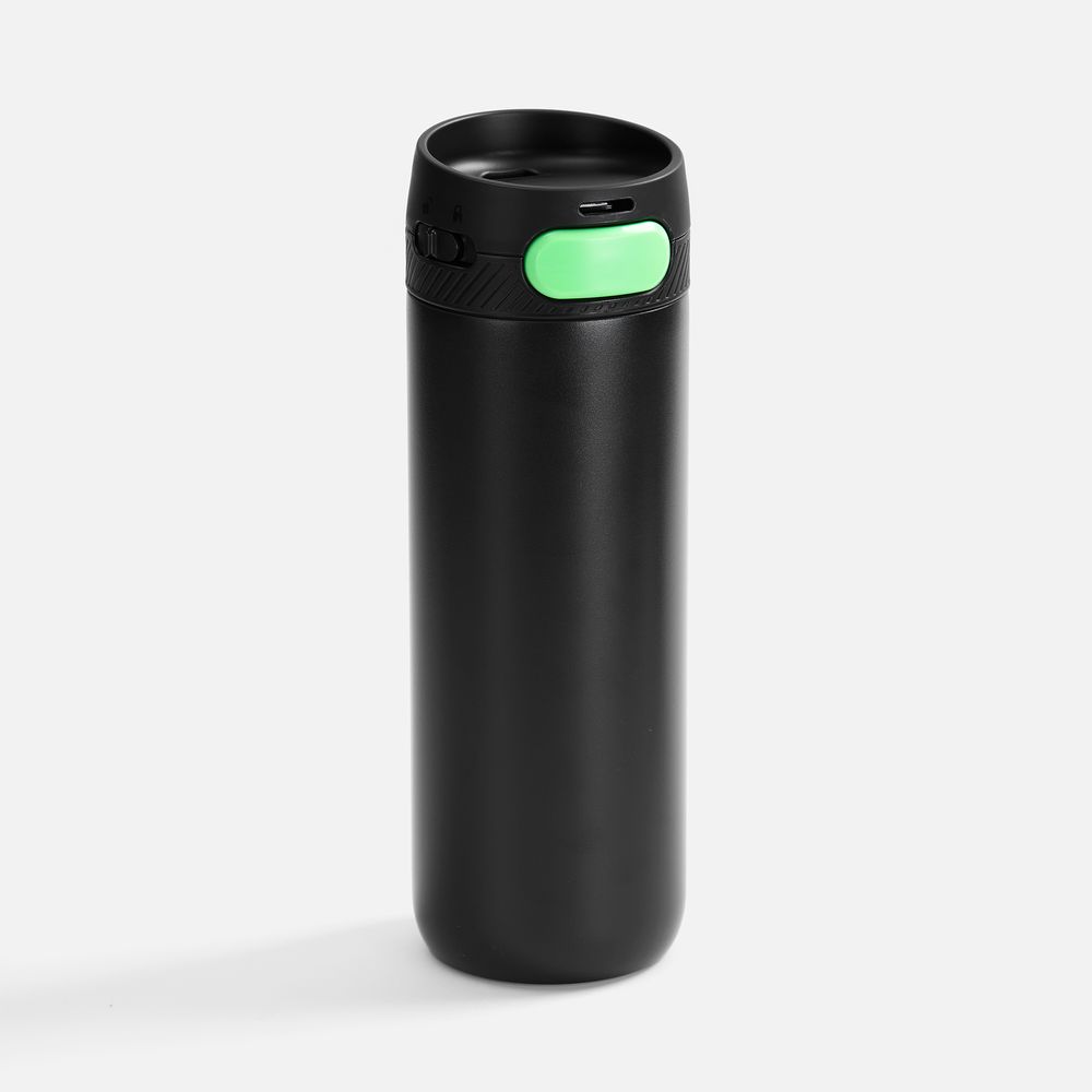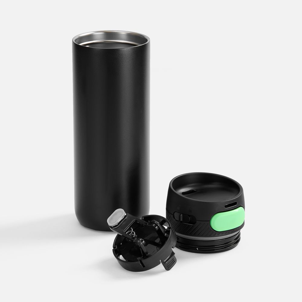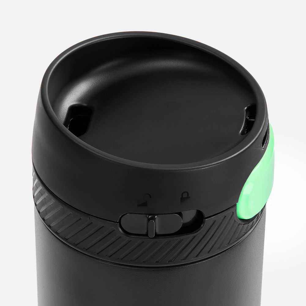 Термостакан X1 с цветной кнопкой, черный с зеленым диаметр дна 7 см, высота 22,5 см; упаковка: 23,7х8,2х8,2 см