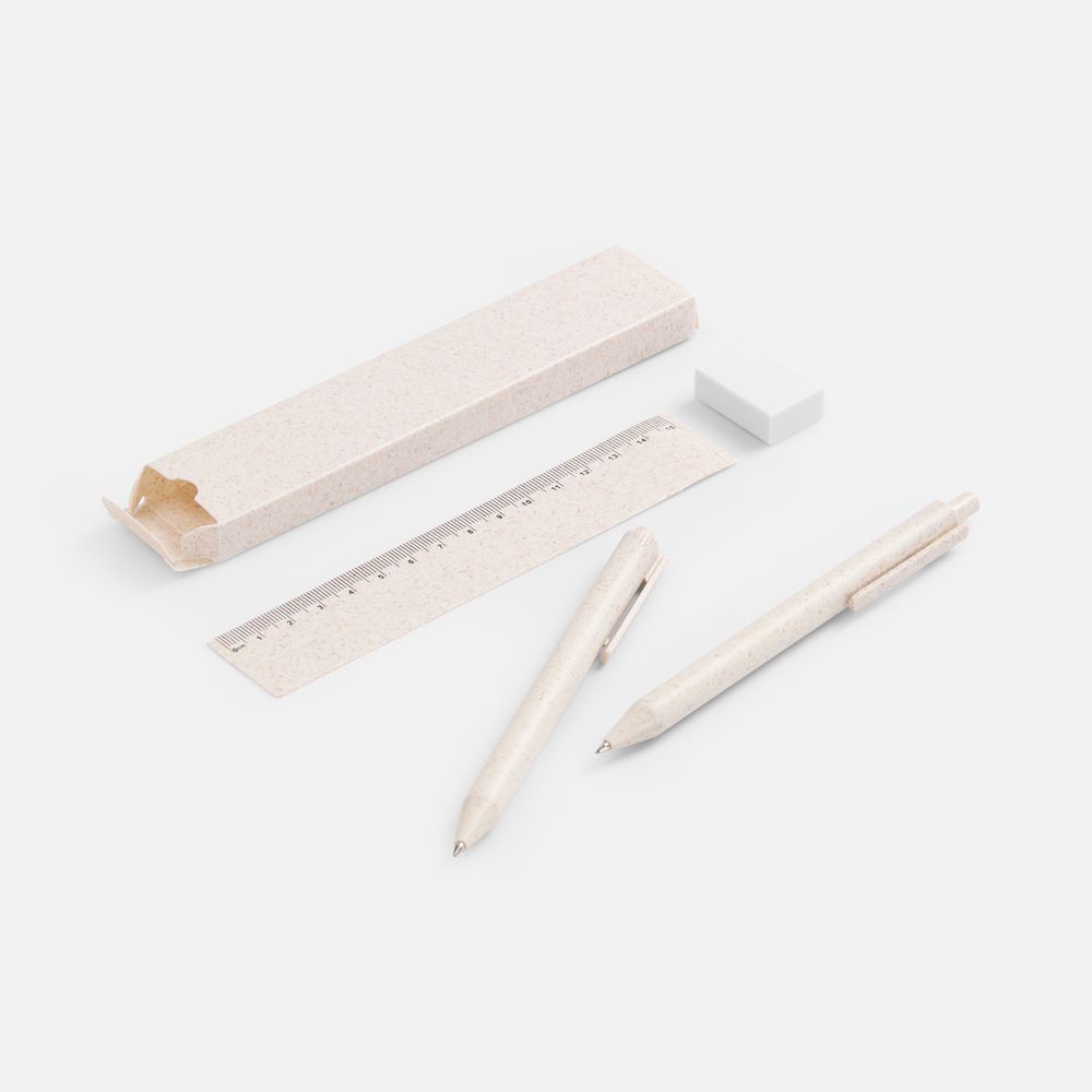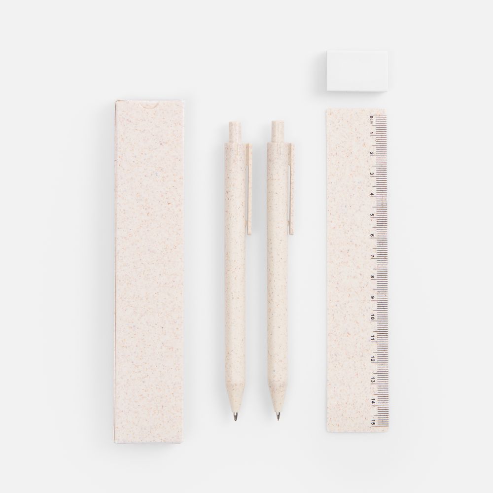 ручка 14х1 см, карандаш 14,1х1 см, линейка 15,5х3 см; упаковка 16,3х3,2х1,3 см