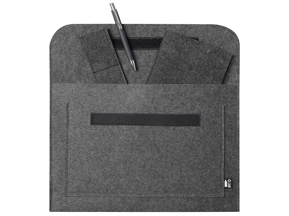 блокнот - RPET фетр, бумага; футляр - RPET-фетр; ручка - пластик, бумага; чехол - 100% RPET полиэстер