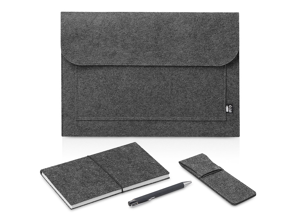 Стильный и функциональный набор для тех, кто ценит простоту и экологичность. В комплект входят: • Блокнот A5 в мягкой обложке из переработанного фетра, • Шариковая кнопочная ручка в бумажном корпусе с пластиковыми деталями, • Пенал для ручки из переработанного фетра, • Вместительный чехол для ноутбуков/планшетов до 14" из переработанного фетра, который служит упаковкой набора. Идеально подходит для офиса, учебы и путешествий. Лаконичный дизайн и натуральные материалы создают ощущение уюта и продуманности в каждой детали.
