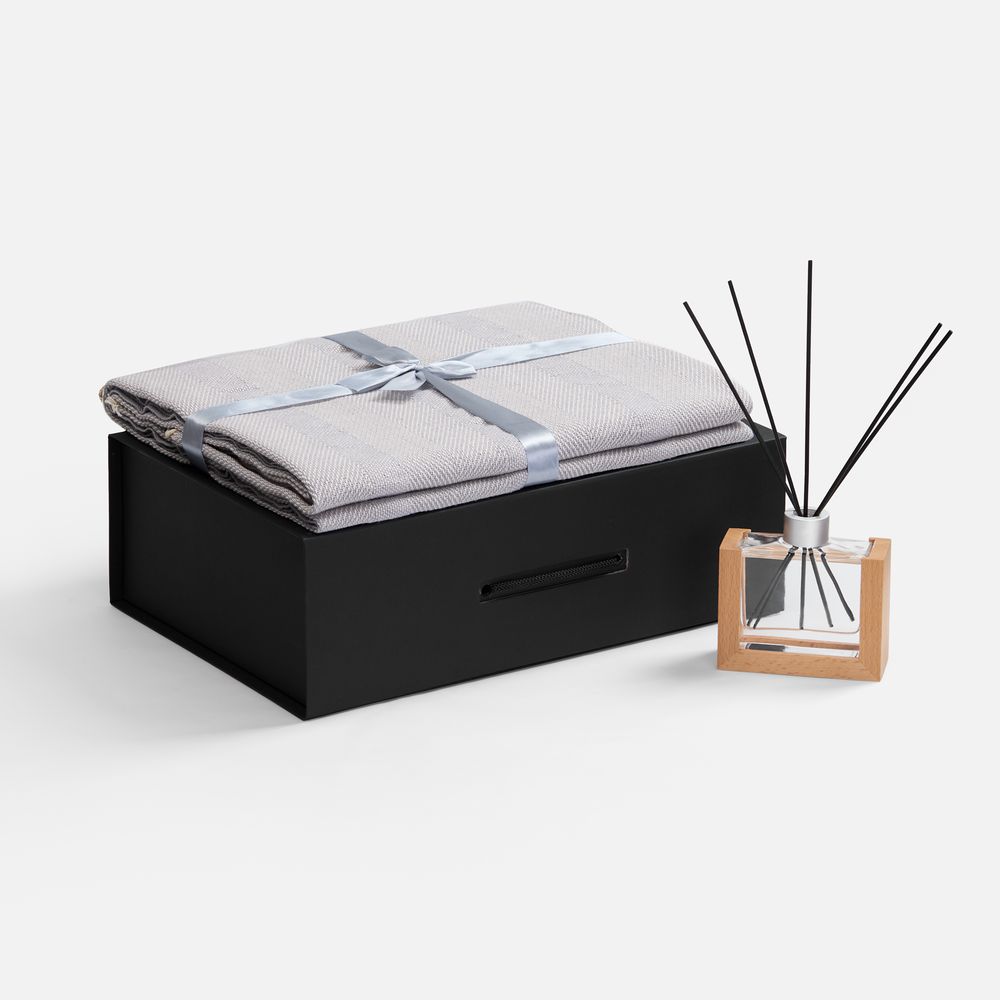 флакон - стекло, палочки из файбера; подставка для флакона - дерево; плед - хлопок 95%, полиэстер 5%, плотность 300 г/м²; коробка - переплетный картон, бумага Malmero