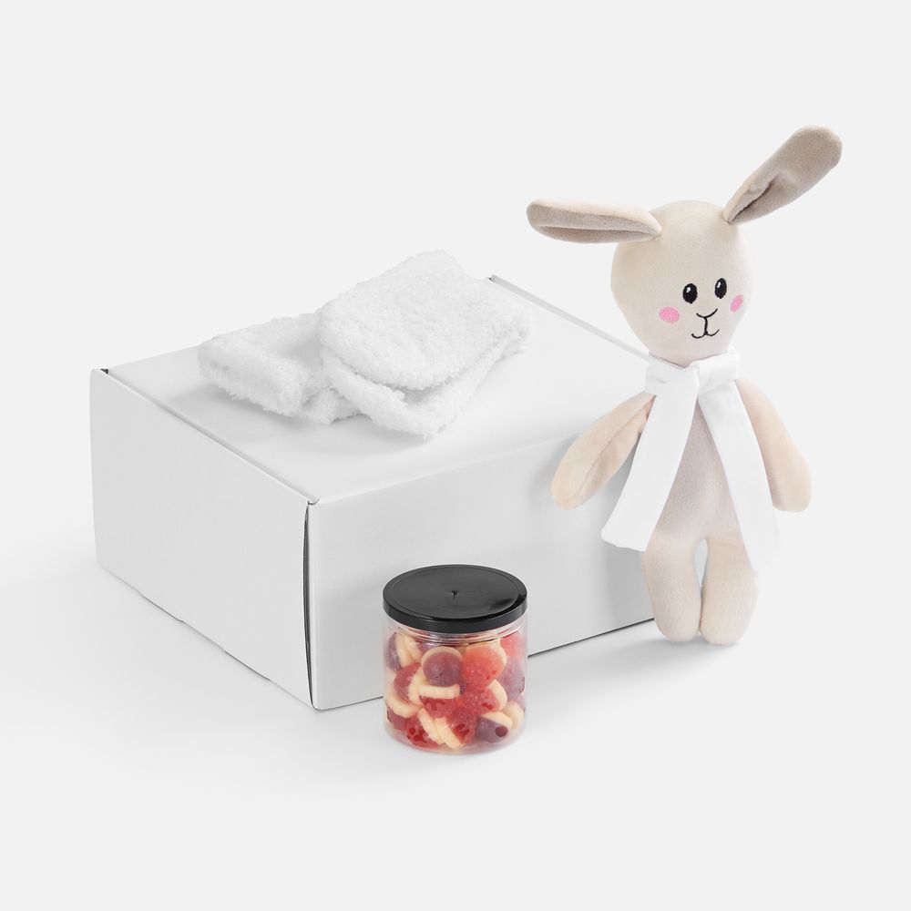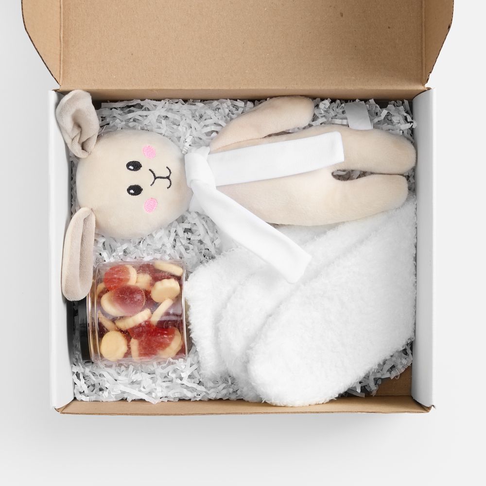 коробка - микрогофрокартон; носки - полиэстер 100%; игрушка - велюр, полиэстер; упаковка мармелада - пластик